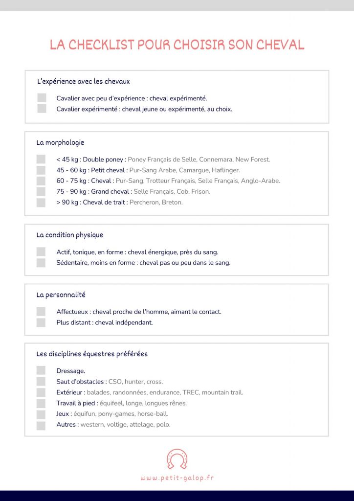 Voici une checklist qui récapitule tous les éléments à prendre en compte pour bien choisir ton cheval. 🙂