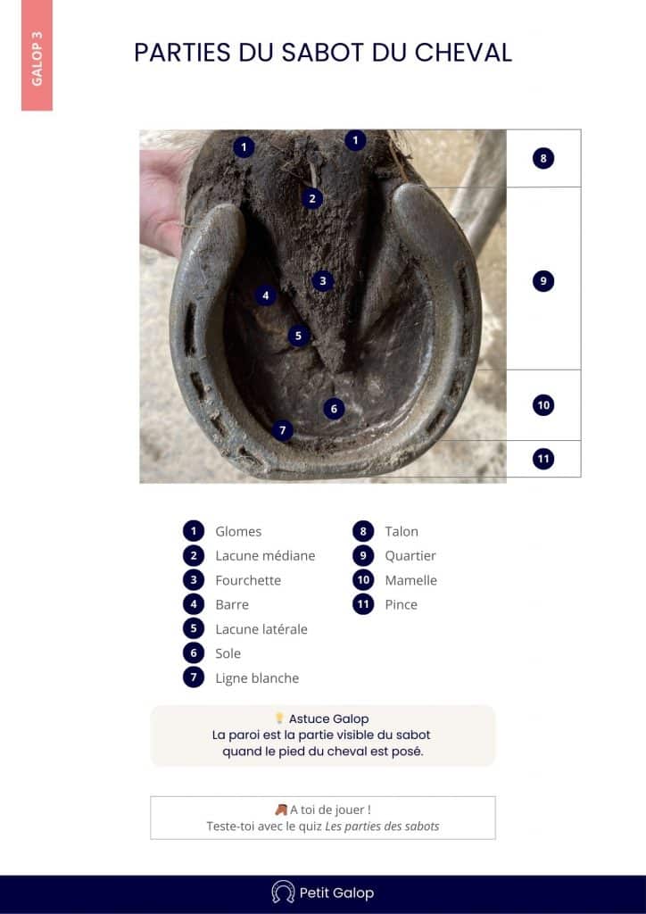 Le dessous du sabot comprend plusieurs parties : les glomes, la lacune médiane, la barre, la lacune latérale, la fourchette, la sole, la paroi et la ligne blanche.