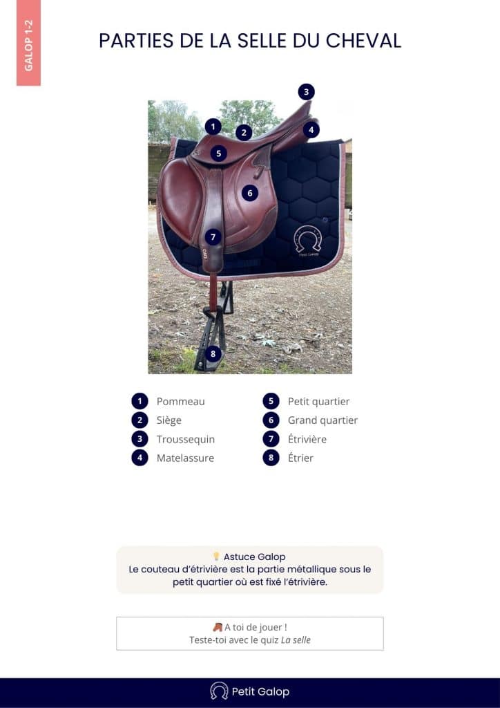 La selle fait partie des connaissances à apprendre pour le Galop 1 et pour le Galop 2.