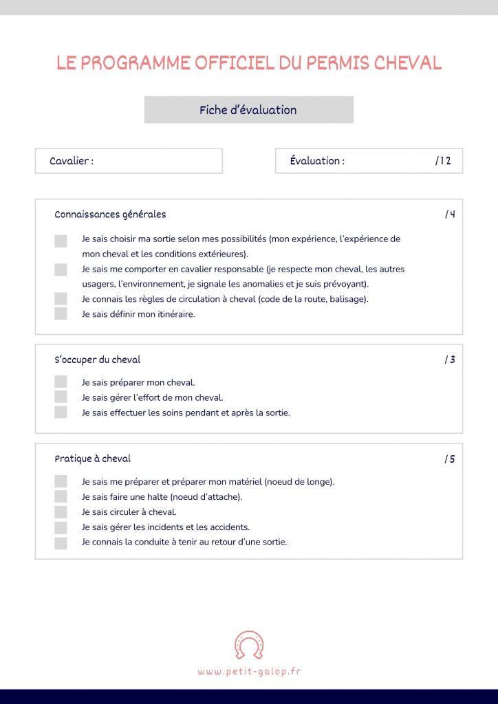 Voici la fiche d’évaluation du Permis Cheval pour que tu puisses évaluer tes connaissances et tes compétences de cavalier. 😉