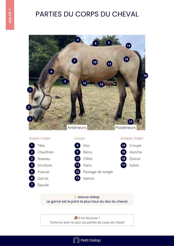 Voici les parties du corps du cheval, au programme du Galop 1.