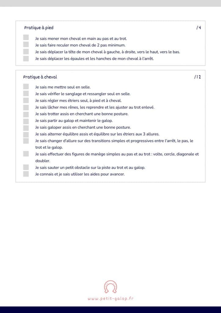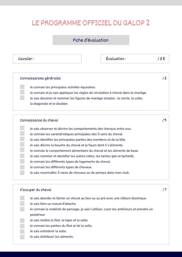 Voici la fiche d’évaluation du programme du Galop 2 pour que tu puisses évaluer tes connaissances et tes compétences de cavalier. 😉